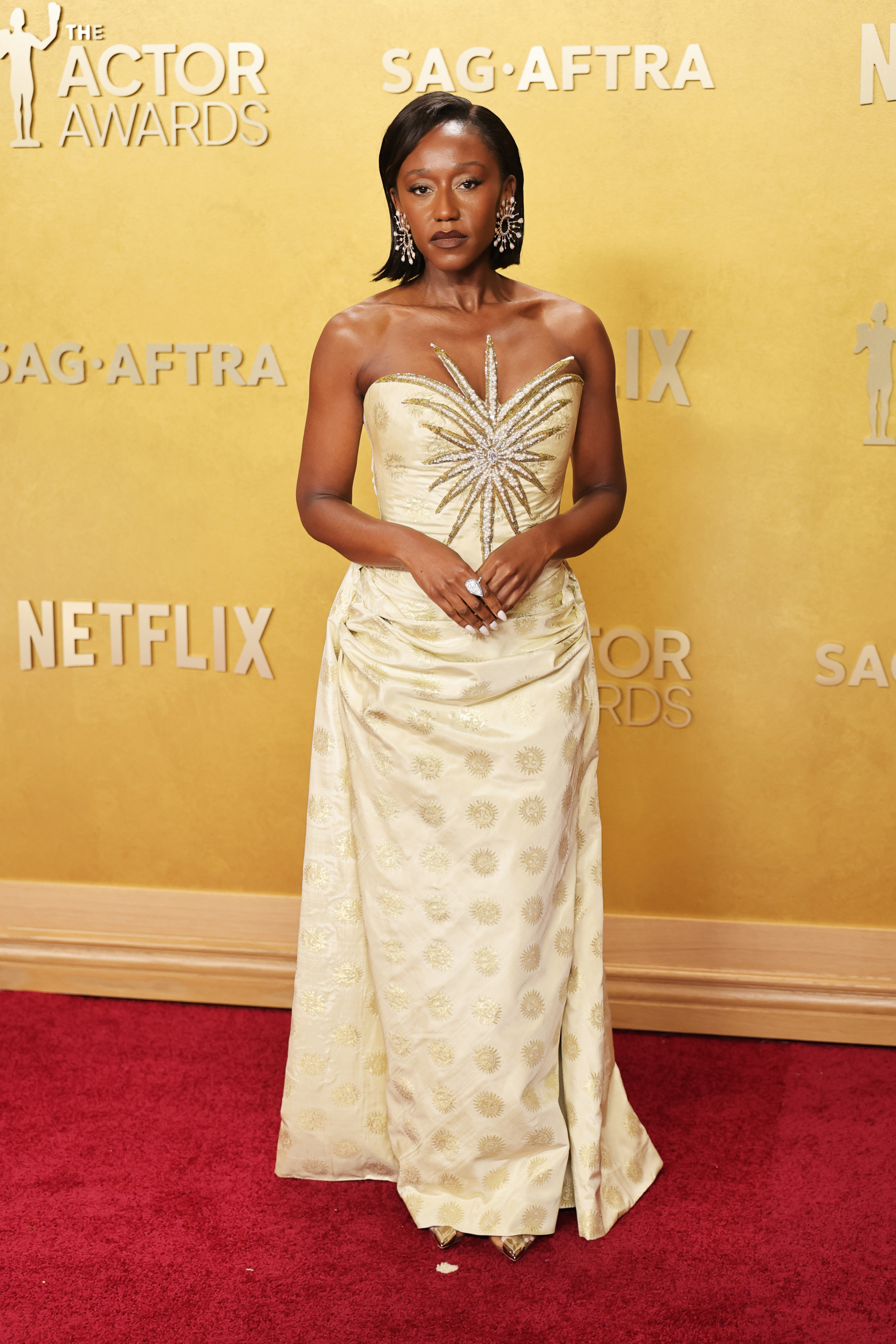 La estrella de ‘The Diplomat’, Nana Mensah, deslumbró con un vestido vintage de Bob Mackie. Su espectacular busto estaba adornado con una piedra de múltiples puntas, mientras que la tela dorada caía en cascada sobre la alfombra para un acabado espectacular. Las llamativas joyas de Boucheron complementaron el look.