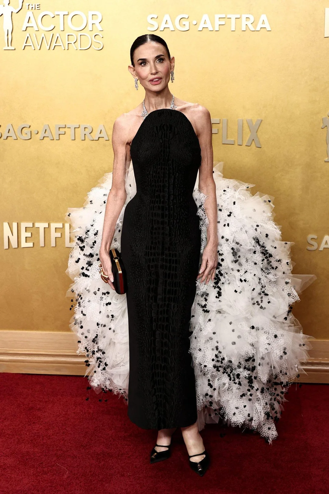 Demi Moore ha deslumbrado con un vestido columna de Schiaparelli. Su vestido de Alta presenta un corte ajustado en el torso, con un corte negro sin tirantes y un escote escultural que se curva hacia arriba formando un sutil arco arquitectónico. La superficie presenta un patrón vertical texturizado, casi de reptil, que aporta dimensión sin brillo. De frente, se percibe controlado y minimalista. Luego viene la espalda. En la parte trasera, un dramático estallido de tul blanco salpicado de delicados detalles negros se extiende hacia afuera en una explosión de nubes.