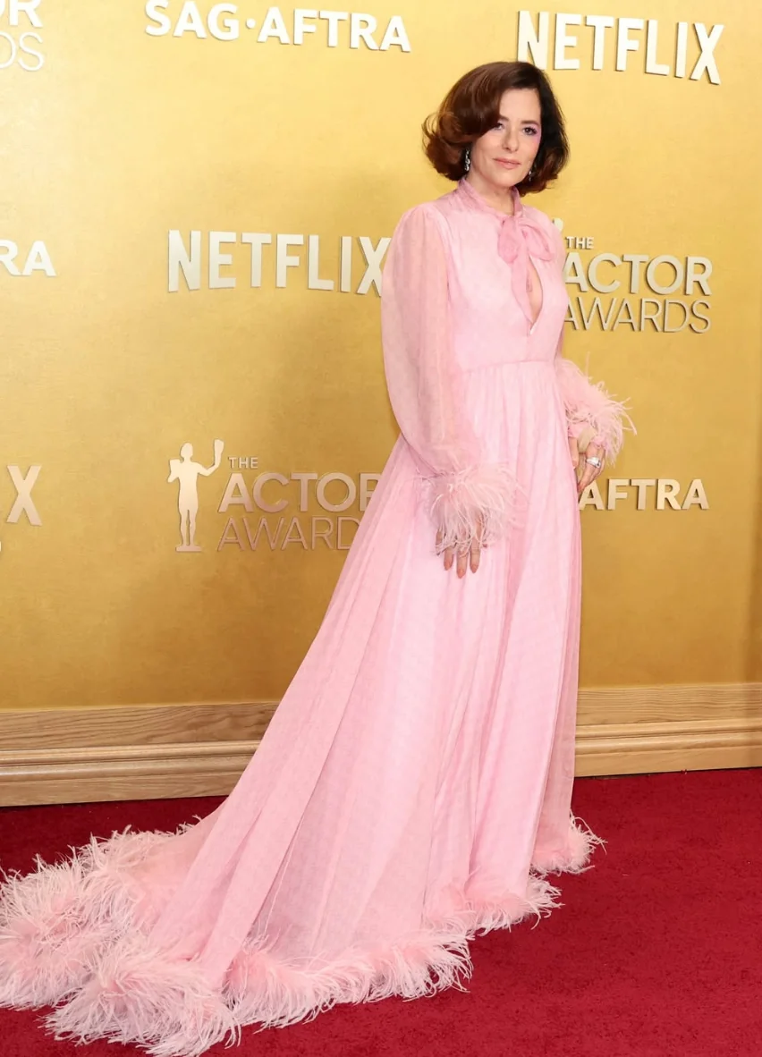 Parker Posey lució un vestido de gasa rosa de Gucci La Famiglia con escote de lazo y una voluminosa falda adornada con plumas. Las joyas de Messika complementaron el look.