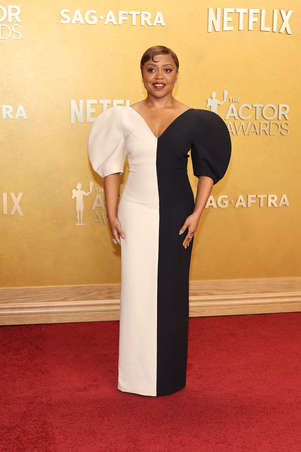 Quinta Brunson agregó un toque gráfico en blanco y negro con un vestido de Gabriela Hearst que deslumbró al instante. Las mangas abullonadas exageradas y el diseño de colores combinados eran audaces, pero la silueta columna lo mantuvo elegante. Las joyas de Tiffany & Co. complementaron el look.