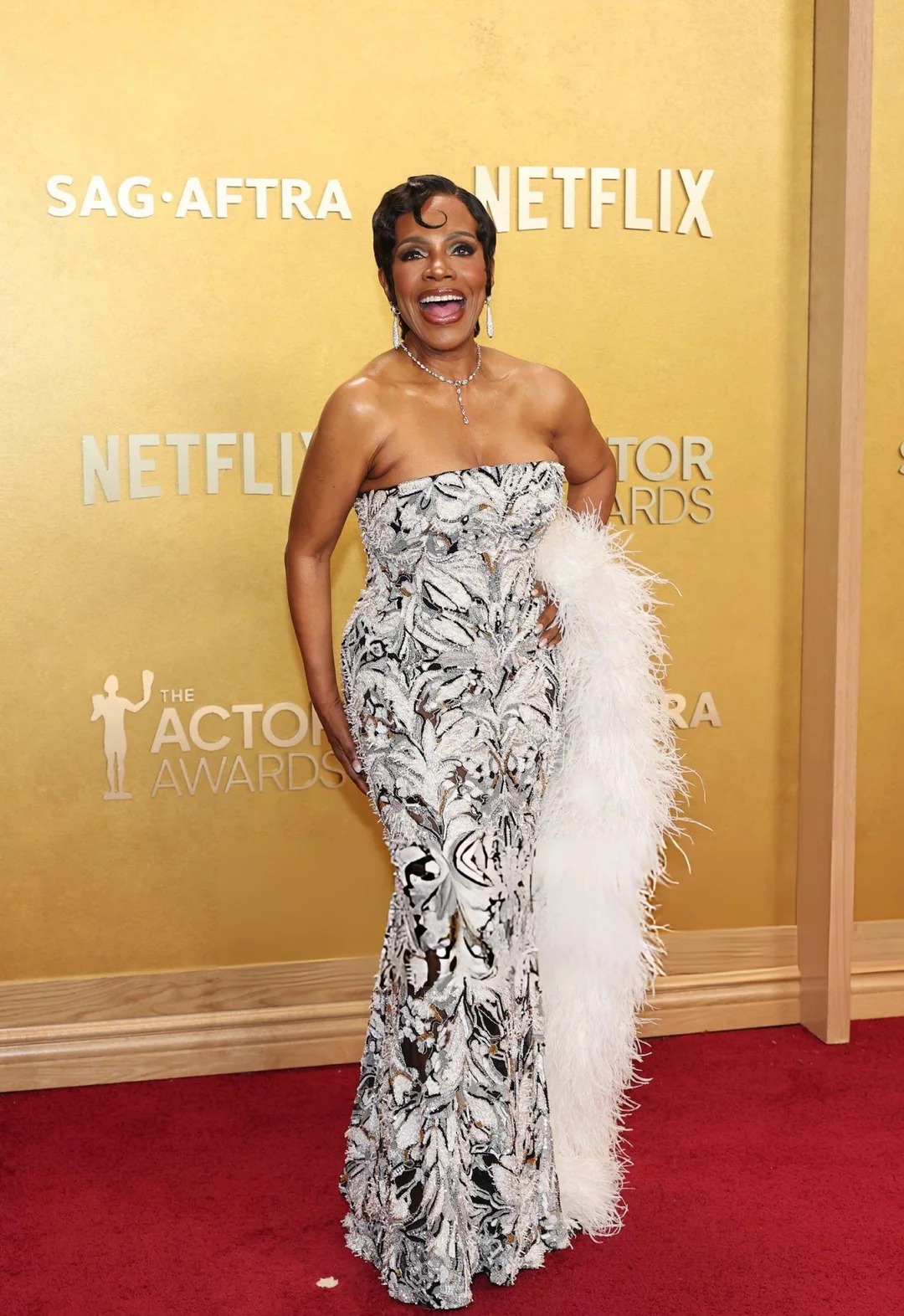 Sheryl Lee Ralph lució un impresionante vestido de Saiid Kobeisy Couture. El vestido palabra de honor está completamente bordado en capas de tono aguamarina pálido, plata y marfil.