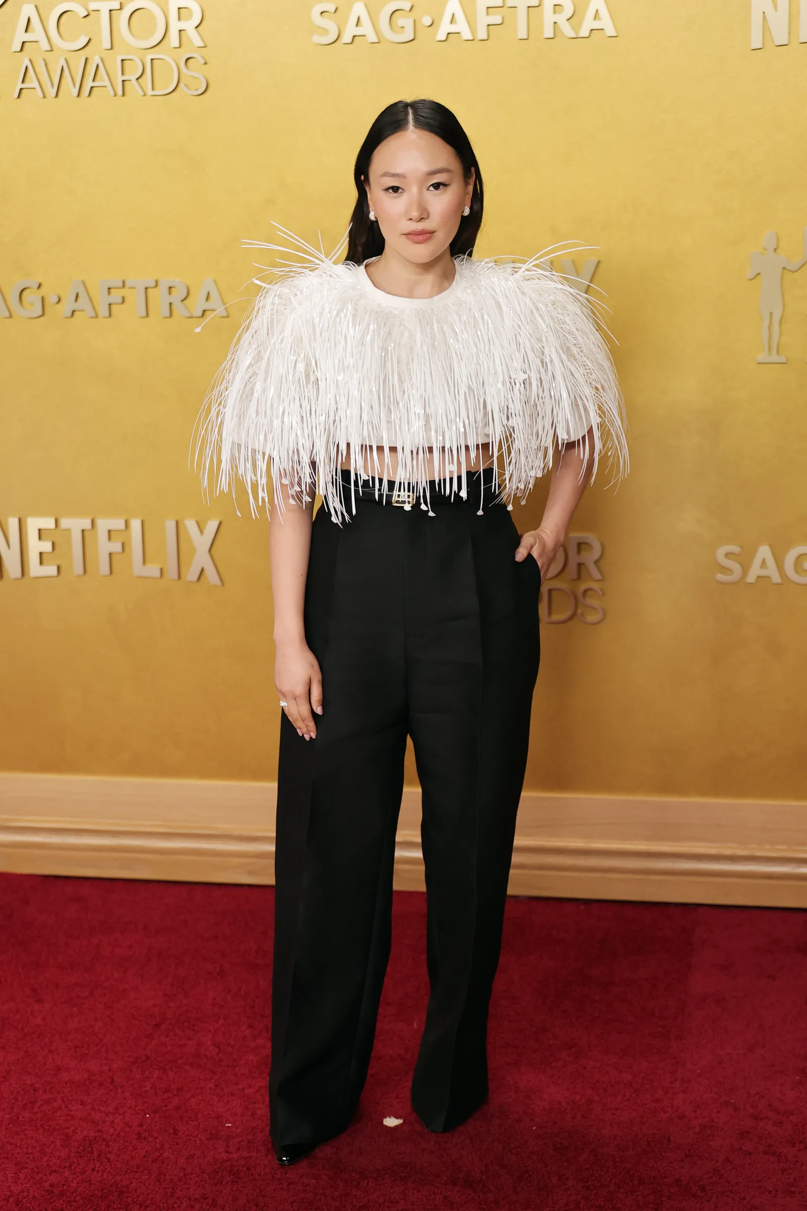 Yerin Ha ha llegado a Hollywood, y sin duda le queda muy bien. La estrella de ‘Bridgerton’ sorprendió con un divertido look de Balenciaga, compuesto de pantalón con pinzas, de tiro alto y corte recto en color negro, que lleva con un crop top color blanco de manga corta y hombreras marcadas, cubierto con delicadas aplicaciones de plumas que aportan textura y dimensión.