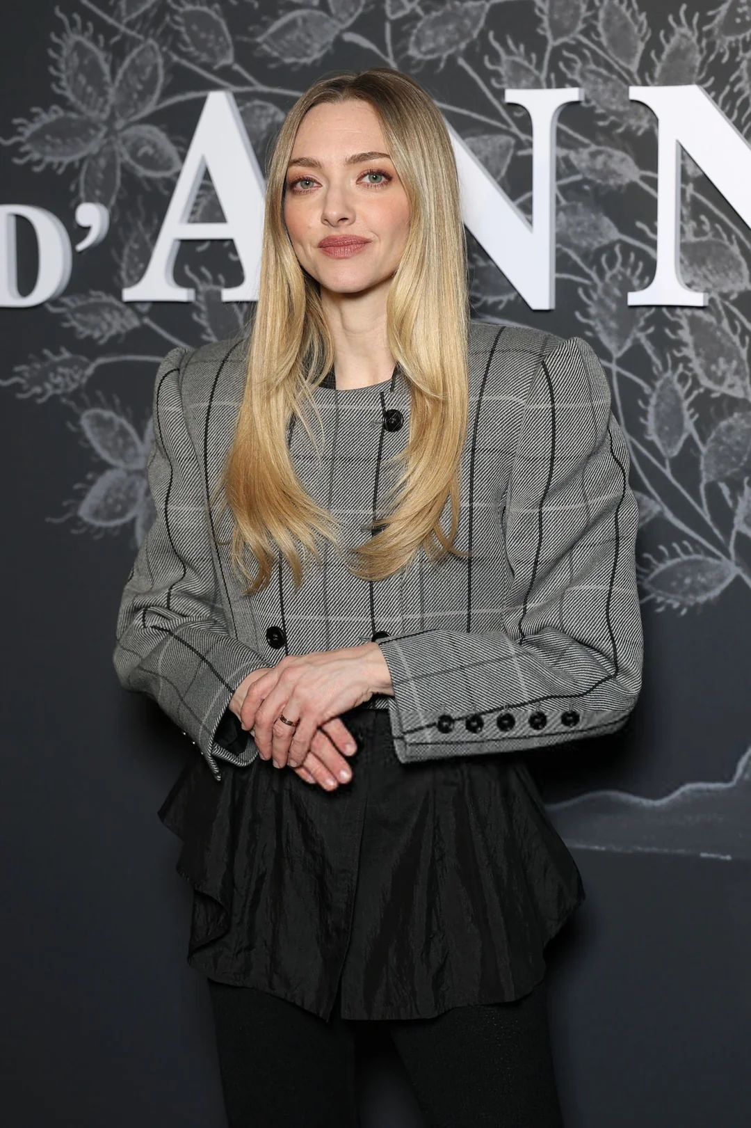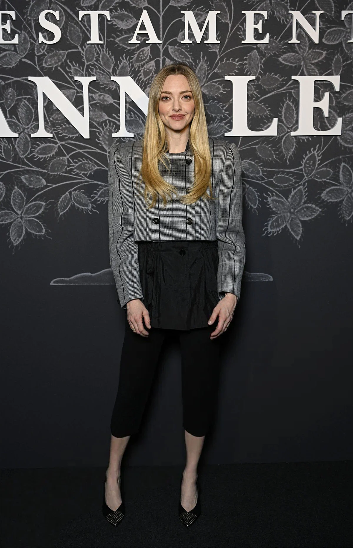 Anoche, Seyfried asistió a la proyección de la película en París con un look que evitaba el estilo formal. El look de la actriz, cortesía de Chloé, se centró en unos capris negros ajustados y una chaqueta de doble capa. La chaqueta cuadrada gris con rayas negras y blancas discretas creaban un patrón de cuadros en la tela. La prenda, de doble botonadura, incluía botones negros y presentaba hombros ligeramente abullonados, mangas largas y un corte corto. Llevaba una prenda corta a cuadros con una gabardina plisada debajo. Unos tacones negros angulares fueron el toque final.