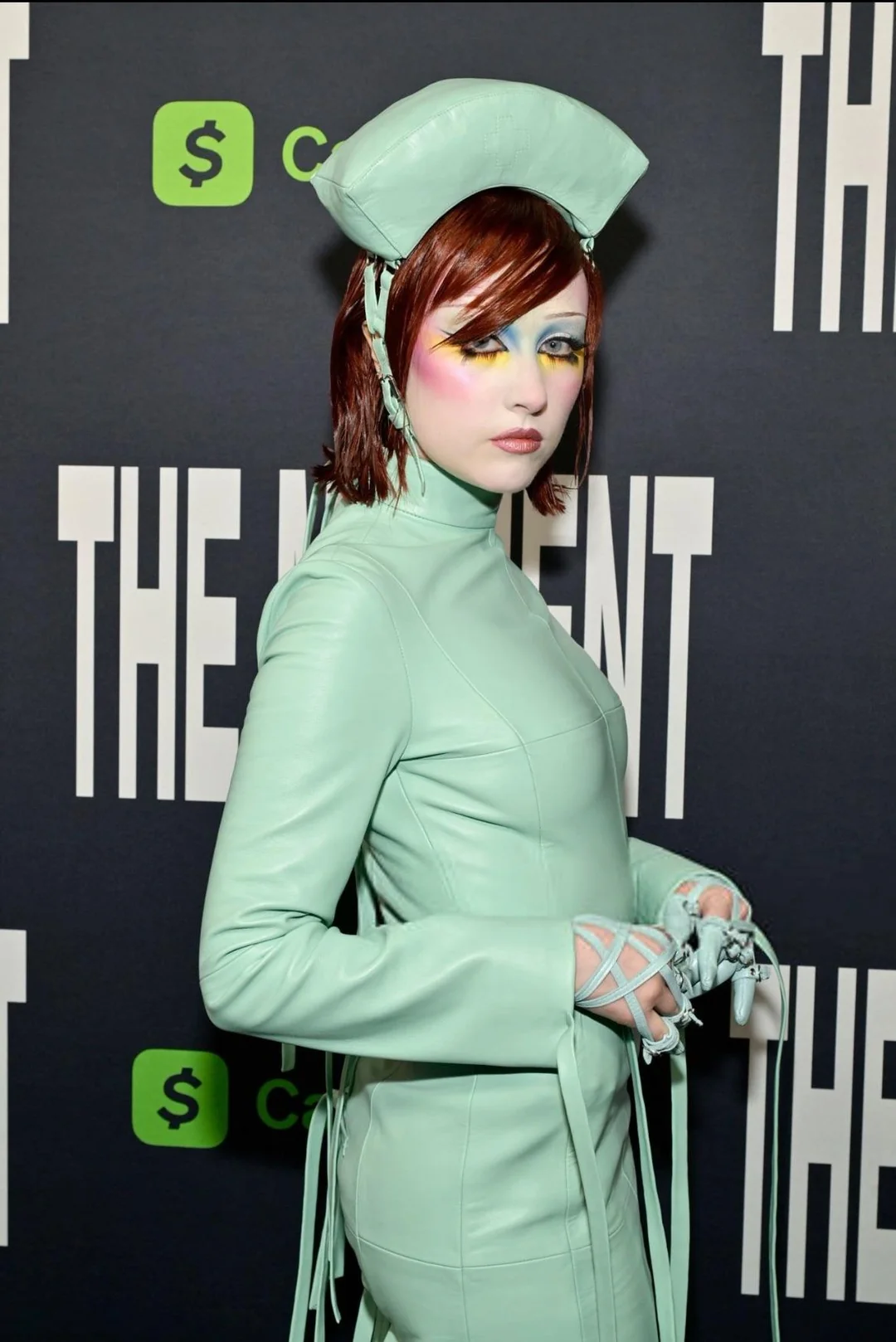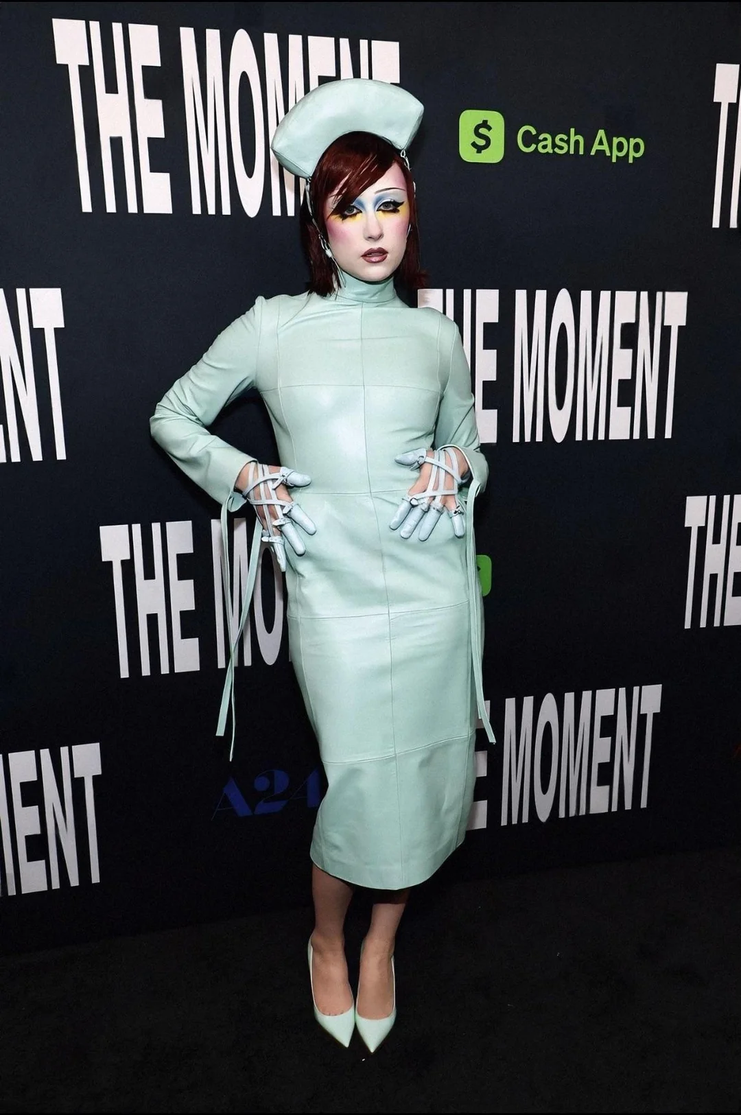Chappell llevaba un vestido de cuero color menta de ILONA by Ilona Perla Marie Claire Slama, que evocaba inmediatamente una enfermera retrofuturista, con un filtro de ciencia ficción de finales de los 60’s. Los guantes y el tocado refuerzan la sensación de uniforme, llevando el look a un territorio de era espacial.