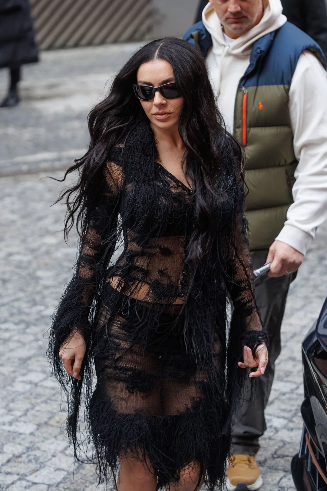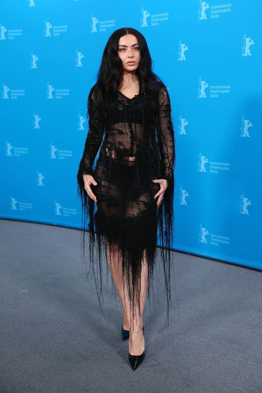 Charli combinó el look con tacones puntiagudos de charol negro y sin joyas. Optó por un estilo minimalista para que el intrincado trabajo textil y la artesanía cobraran protagonismo. Su larga melena oscura, suelta y con raya al medio, contribuía a la estética melancólica, enmarcando su rostro y suavizando la intensidad del atuendo. El efecto general era romántico y rebelde a la vez. Era una mezcla de delicadeza y destrucción.
