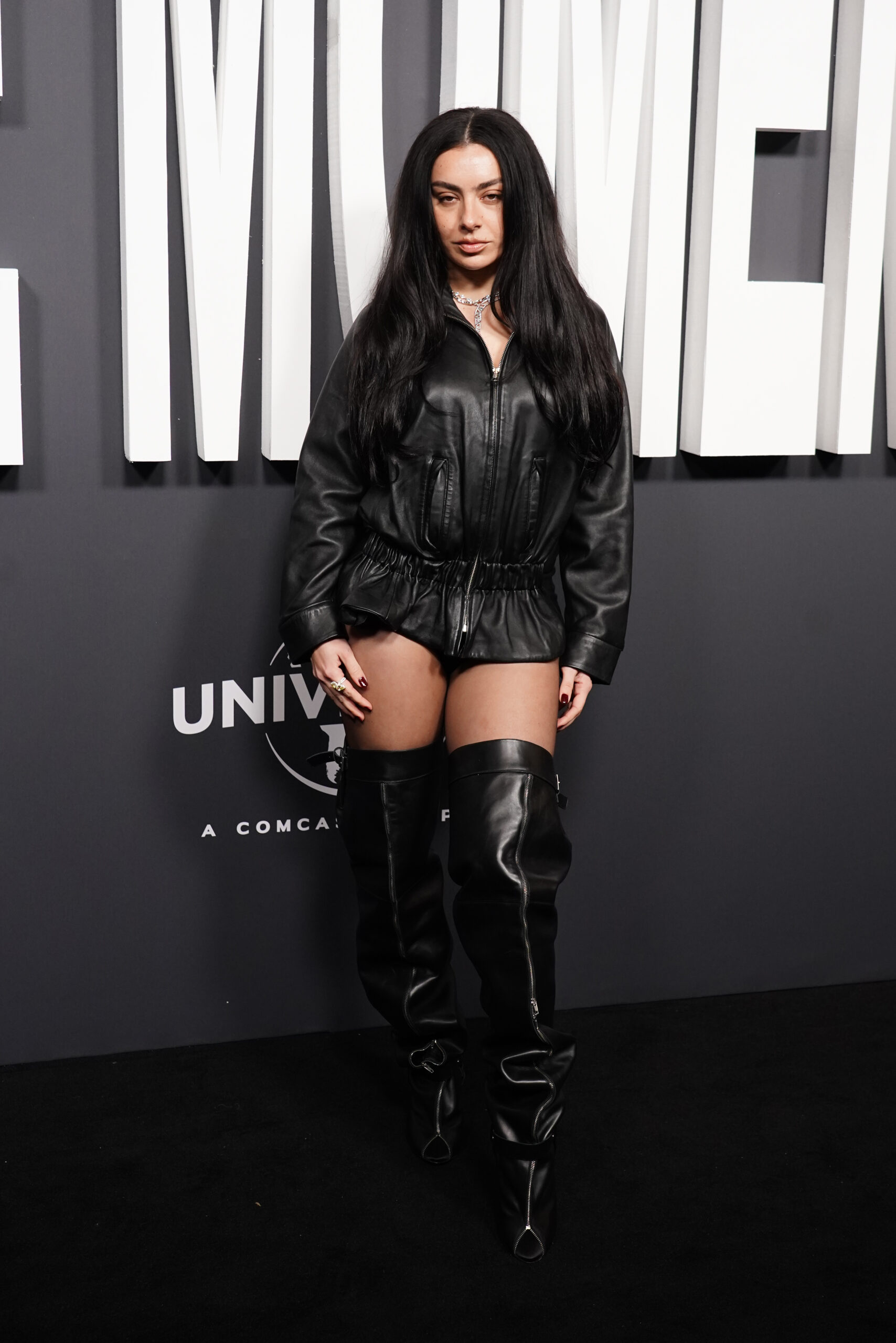 Confeccionada en cuero negro, la prenda presentaba amplios bolsillos en el pecho, una cremallera central y un detalle acampanado que le daba un toque de feminidad. Aunque el estilo original de la chaqueta incluía pantalones, la señorita XCX los evitó por completo y optó por unas botas altas hasta el muslo, negras y sin cremallera. La artista de ‘360’ complementó su look con joyas con incrustaciones de diamantes, como pendientes, un collar y varios anillos, de Claude Morady.