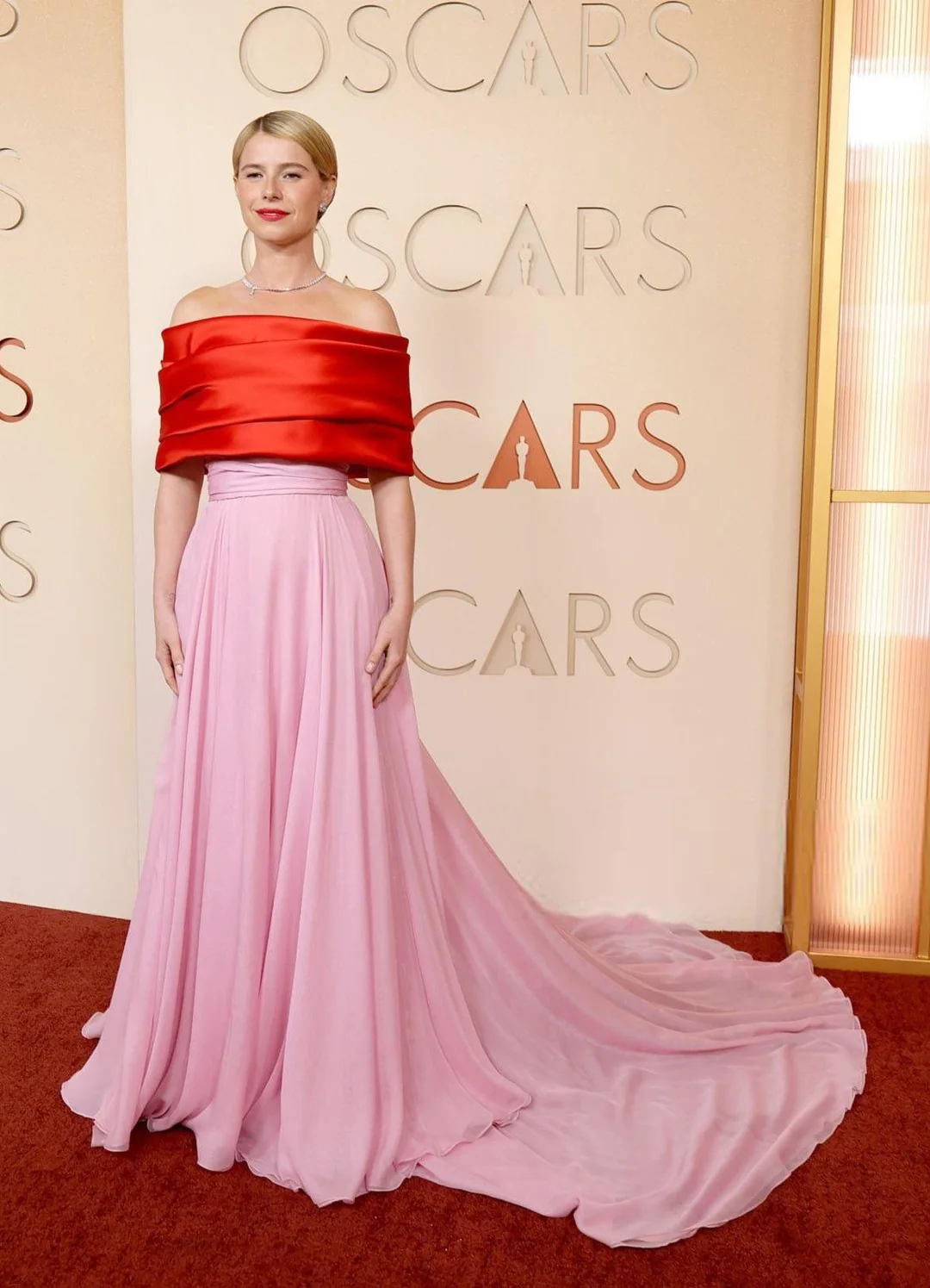 Cuando la actriz irlandesa apareció en la alfombra roja, lo hizo con un diseño de Chanel hecho a medida. Eso ya es un dato fabuloso: ¿cuántas personas pueden decir que han tenido un vestido de la mundialmente famosa casa de moda francesa hecho a su medida? Pero el vestido rojo escarlata y rosa chicle de Buckley fue tanto un momento importante de estilo personal para ella… como un sello distintivo del Old Hollywood.