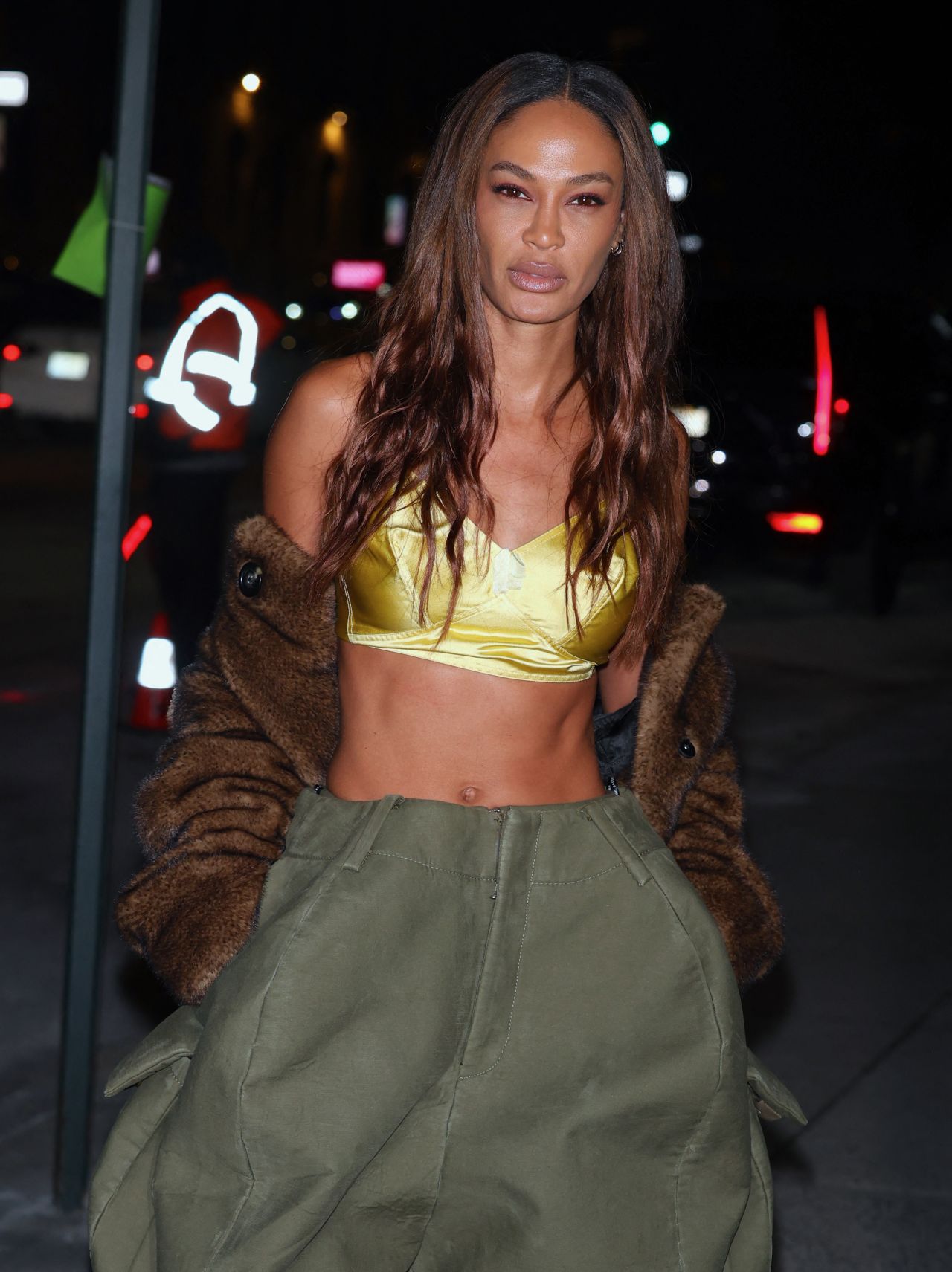Smalls optó por un look minimalista en la parte superior. Llevaba un top amarillo mostaza que dejaba al descubierto su abdomen tonificado, con un abrigo marrón de piel sintética que adorno con desenfado sobre sus brazos. Los rizos despeinados y una piel natural y radiante fueron el toque final.