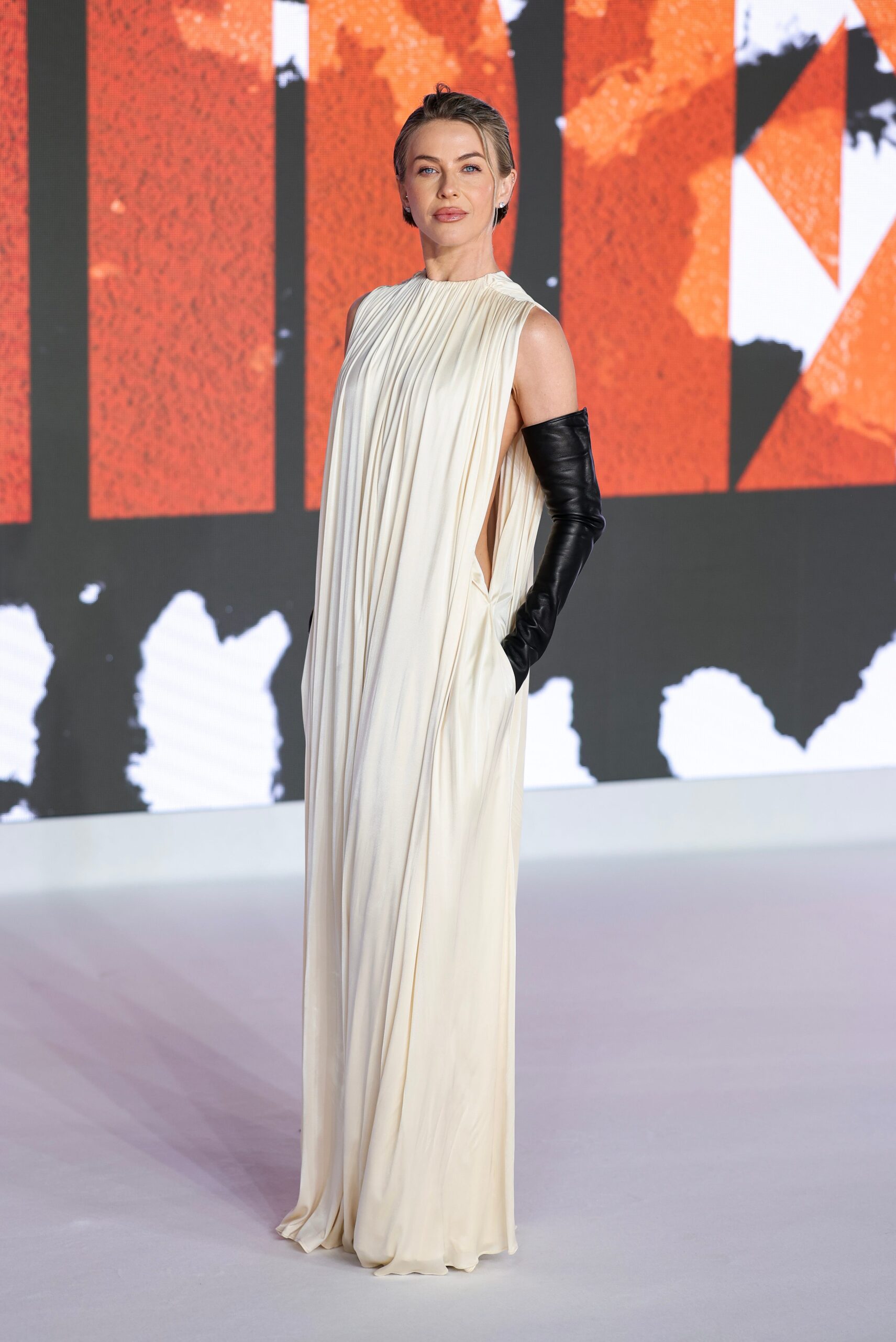 Para llevar su look al siguiente nivel, la actriz optó por unas sandalias de plataforma alta. Llevaba el cabello corto, liso y con un look húmedo, que combinaba a la perfección con su maquillaje discreto, dejando que el atuendo sea el protagonista. La ausencia de joyas llamativas centra la atención en la interacción entre el vestido fluido y los guantes estructurados.