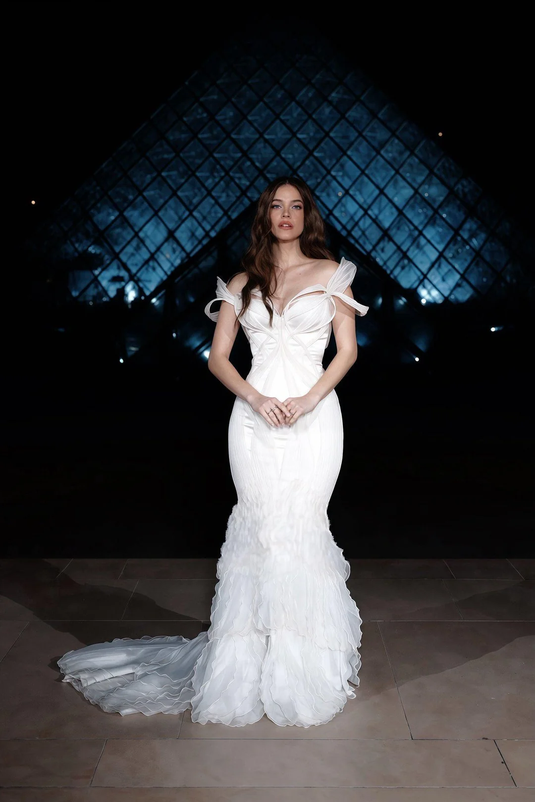 Barbara Palvin fue toda una visión etérea con un vestido de Alta Costura de Iris van Herpen. El vestido blanco quizá no sea tan fluido arquitectónicamente como otros vestidos de la diseñadora holandesa, pero la silueta esculpida y las capas ligeras son igual de impresionantes. Las joyas de Yvonne León complementaron su look.