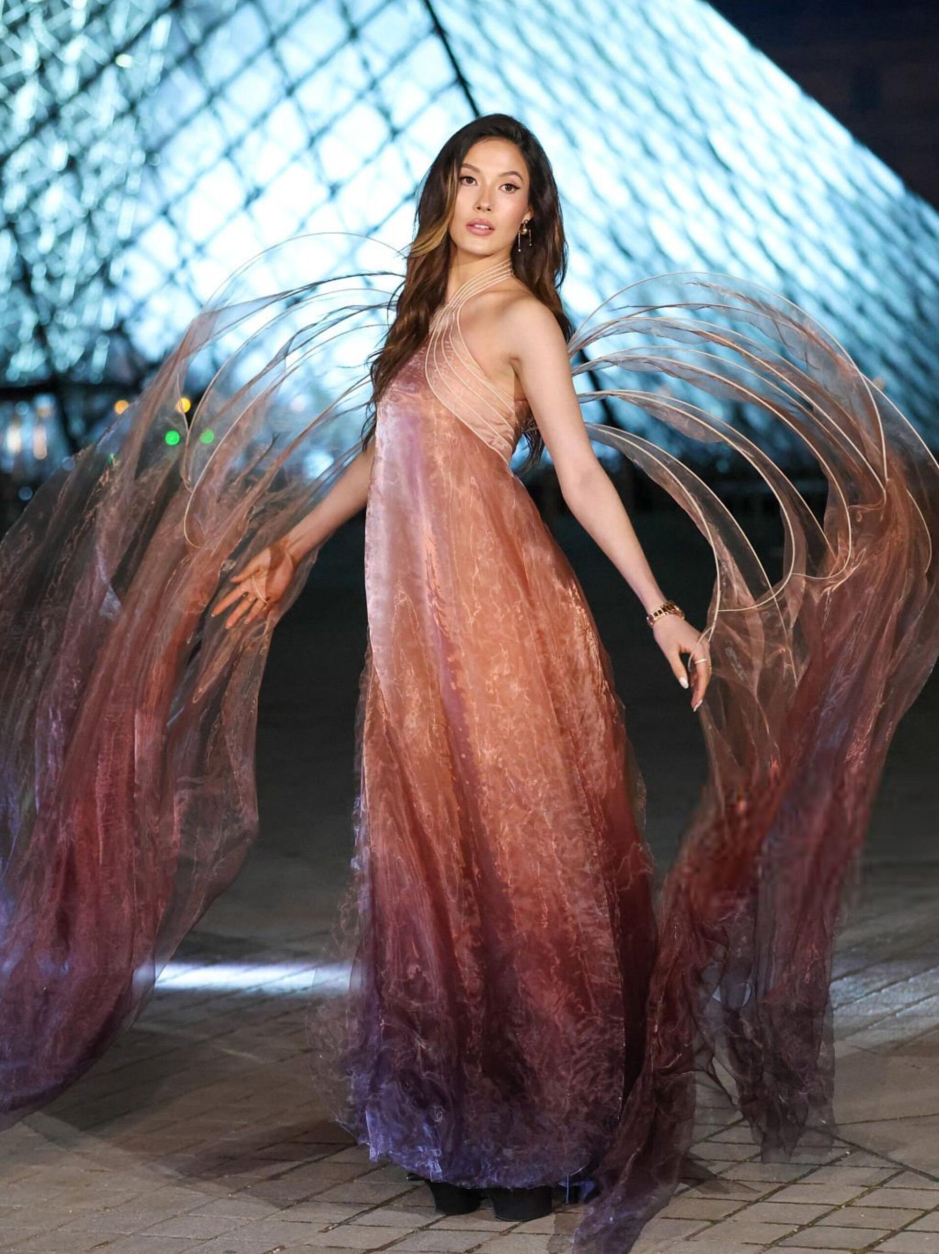 Adot Gak presentó una de las siluetas más impactantes de la noche con un vestido de Rahul Mishra Couture Otoño 2025. El corpiño esculpido, los paneles de lunares transparentes y el escote al aire crearon un acabado dramático que se adaptaba perfectamente a la grandeza del Louvre, junto con esa impresionante gargantilla llamativa. Hizo suyo este look.