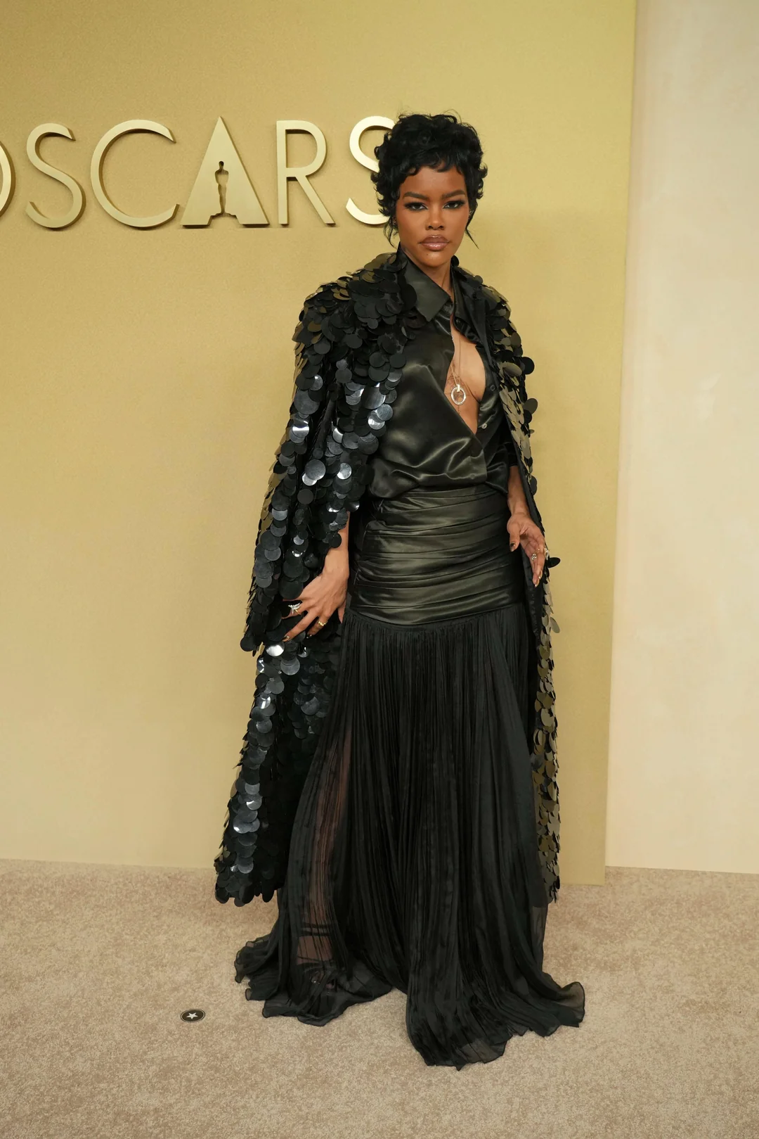 En esta ocasión Teyana Taylor ha apostado por la firma Cong Tri y ha triunfado con un vestido compuesto por una camisa satinada negra y falda semitransparente vaporosa. La dosis de alto impacto la ha aportado la capa, una pieza de lentejuelas en clave XL, de Altuzarra.