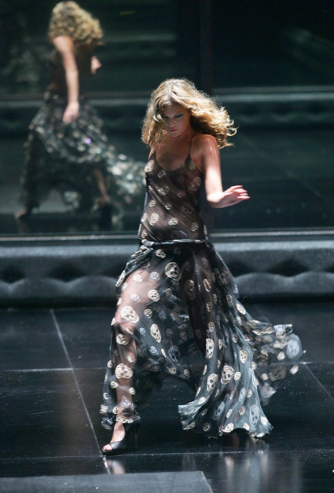 Aunque el desfile de Alexander McQueen se salió del programa habitual de la Semana de la Moda de Londres, el vestido con estampado de calaveras marcó un hito en la historia de la moda. Kate Moss posó en la pasarela completamente negra con un vestido casi idéntico al de Robbie. El escote redondo, la falda asimétrica y todos los elementos intermedios parecían transparentes, una vez más. Cabezas de esqueleto blancas se extendían desde el corpiño hasta el bajo.