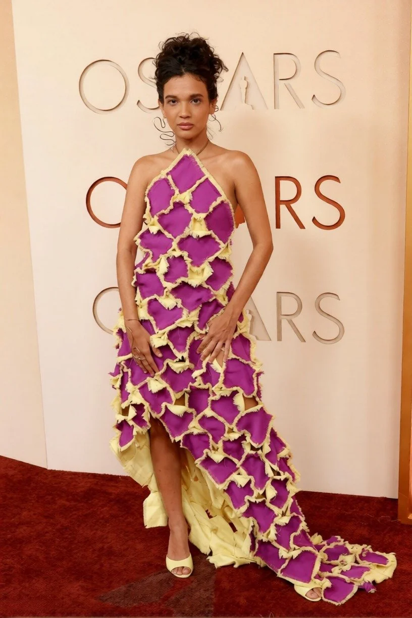 Chase Infiniti lució un vestido lavanda de Louis Vuitton para su primera gala de los Oscar. El vestido de seda estaba rematado con un detalle de volante asimétrico de varias capas que caía elegantemente por el lateral. El colorido diseño requirió más de 750 horas de trabajo. Las joyas de De Beers complementaron su look.